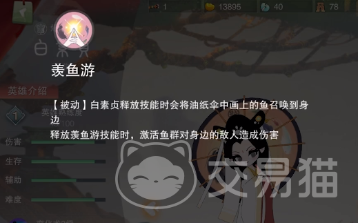 羡鱼游:是被动技能,在每一次在释放技能之后都可以召唤出鱼。一旦在激活画中鱼之后就可以展开伤害,而且造成的伤害比较可观。
