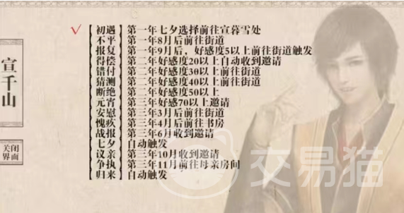 宣千山这个角色在婚前是最容易攻略的,在第三年之后与宣千山的好感和剧情任务都完成能够选择与他成亲。第一步很重要在第一年的七夕节选项中一定要选择前往宣暮雪家,不选择选项宣千山这条线就会断掉!开启这条线之后玩家就要不断的绣荷包送礼物来刷宣千山的好感度,根据图表前往地点触发相应事件,这里需要注意着第三年的时候一定要去偷听父母的话,不然直接会被送进宫直接结局!