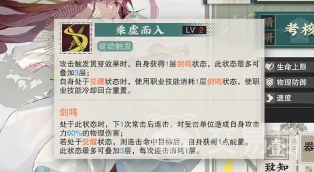 核心技能“乘虚而入”:当攻击触发贯穿的buff同时,越王勾践剑会获得“剑鸣”buff,每层“剑鸣”buff都能显著提高贯穿强度,最多可叠加三层。在觉醒状态下使用职业技能时,消耗一层“剑鸣”状态可以重置职业技能的后续cd。也就是说玩家可以通过巧妙地触发和利用“剑鸣”状态,实现连续技能的释放,从而在战斗中造成连续的高额伤害。