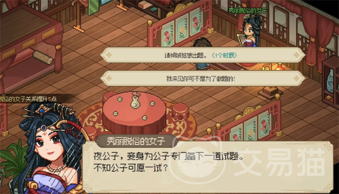 在游戏中,与角色建立良好关系的途径之一是通过交谈和赠送礼物来增进彼此的感情。这样做可能会使你有机会邀请她成为你的队友。然而,这项任务需要策略和时机,因为只有在特定的场合,比如当付瑶琴不在时,你才能向顾倾城发出邀请。这要求玩家必须注意游戏中的环境和时机,以确保成功。