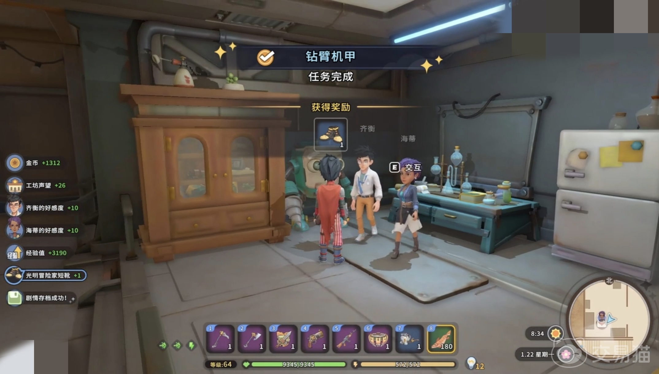 随着剧情对话的深入玩家再次得出结论,这次锻造的钻臂机甲属于二代机甲,改良成了更为精良的微型钻头,比一代机甲增加了更多功能,使用范围更广。对话完后,这条关于钻臂机甲的支线剧情就结束了,玩家会获得两位npc的好感度,以及一些金币和经验值,还有一件装备。