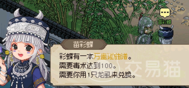 首先,玩家需要先解锁【妙音坊】的前置任务【顾倾城事件】,游戏中才会出现一个叫做【憨厚可掬的女孩】的NPC,并且玩家需要和这个女孩互动交谈,通过交谈来获得这个女孩子的真名才可以,在第一次交互的时候,苗彩蝶会要求玩家一起和他看虫子,并且如果玩家的毒术属性达到了100,则可以从苗彩蝶手上获得一本【万蛊谣曲谱】同时获得苗彩蝶的好感度。