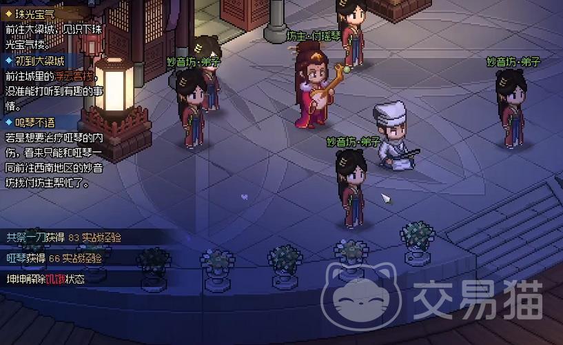 当玩家加入儒圣馆并与哑琴完成互动后,可在战斗胜利后将她带到妙音坊,了解治疗哑琴内伤的方法,同时从坊主口中得知哑琴的过去,并承担下帮哑琴寻回广陵散的任务。此刻玩家若是已经拿到了广陵散,则能直接跳到最后一步。