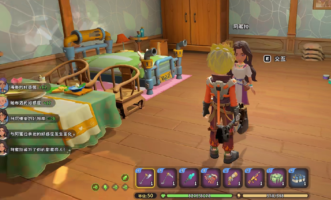 首先,玩家需要做足够多的【悠闲藤椅】,所需要的材料有【黄麻】五个、【硬木棒】四个、【树皮】四个,不仅如此,玩家还需要多和阿蜜拉互动,聊天、打牌、送礼,玩耍互动的时候要在长椅上面赠送阿蜜拉礼物,这样才能增加更多的好感度,将好感度提升到【亲密恋人】的时候,玩家就可以向阿蜜拉求婚了。