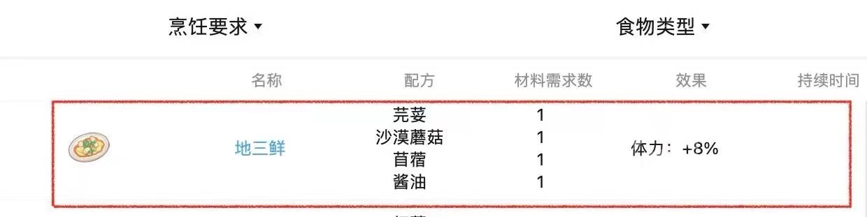 (2)地三鲜:需要沙漠蘑菇、酱油、芫荽、首蓿几款原料,能够提升体力上限的8%。