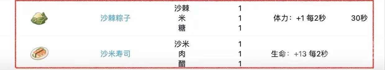 (1)沙棘粽子:需沙棘、米、糖几款原料,能够持续三十秒增加体力,且每两秒提升1体力值。