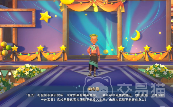星光为主题的时装秀,主要是以蓝色基调为主,不少服装上还叠加了星星的元素,看起来十分闪烁。在礼服展示完毕之后,小伙伴们还可以去找帕布洛登记自己的意向,后续这个礼服是否会生产,还是要看大家的意见。