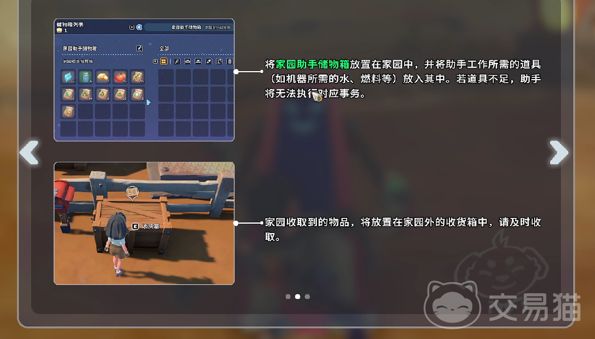 在NPC【海蒂】走后,玩家可以自主和机器人进行交互,该机器人的功能非常多,可以帮助玩家进行储物、耕种、喂养坐骑等等,但是需要玩家给机器人实装芯片才能够运作,在使用机器人时,玩家需先选中任务事项,例如【耕种】、【收获】、【割草】等等,初级的机器人只能够完成【收获】和【储存物品】等简单的工作,后续需要玩家继续升级机器人。