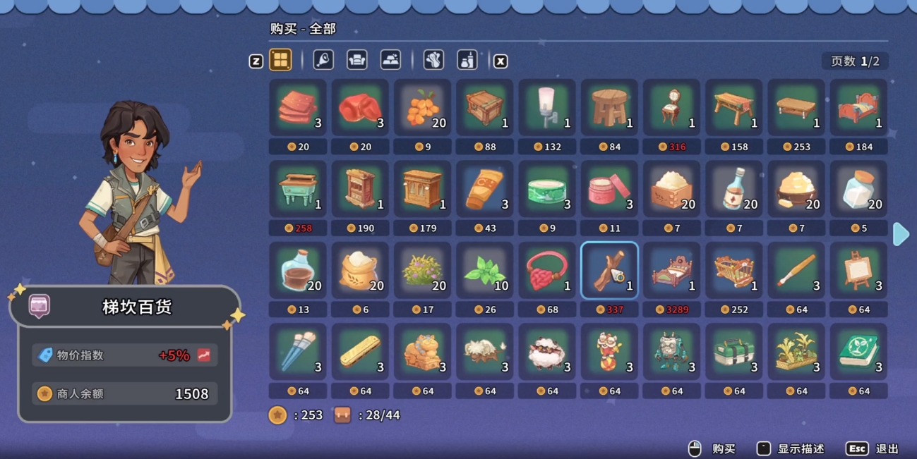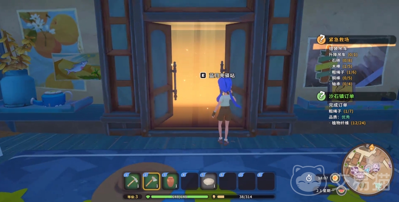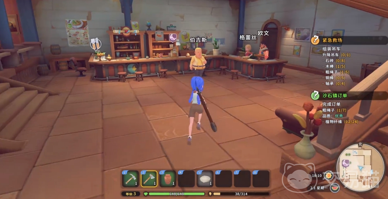 而蓝月亮驿站则在镇务大厅对面,是玩家们初期解决温饱的好地方(可免费吃饭),并且里面也贩卖一些与食材有关的道具,且蓝月亮驿站距离玩家的庄园更近。只不过玩家需要进入蓝月亮驿站才能找到购买商品的互动点,不像梯坎百货那样可直接在外面就直接完成购买,这也使得两家商店各有优势。