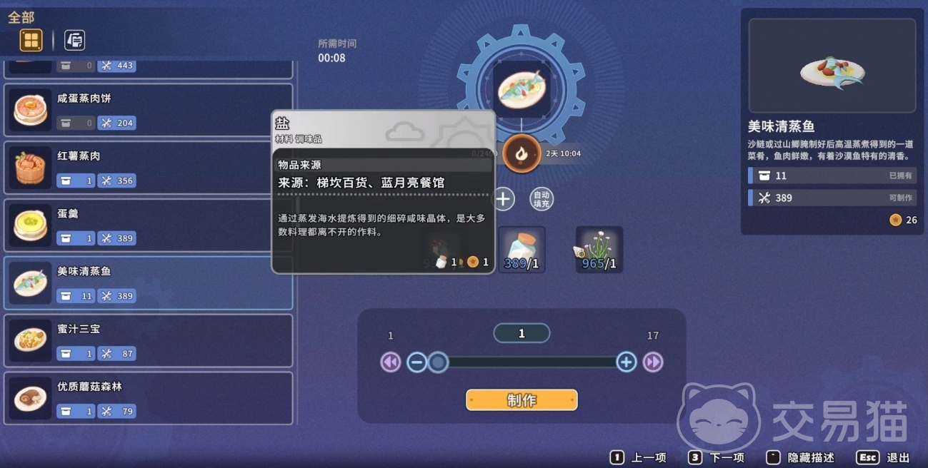盐在沙石镇时光里是一件需要玩家从商店购买的物品,除此之外没有其它的产出途径。玩家只要将点开盐的详细信息,便能发现沙石镇目前仅有两家商店贩卖盐,分别为梯坎百货和蓝月亮驿站,无论玩家前往哪一家进行购买都可以,在价格上没有区别。