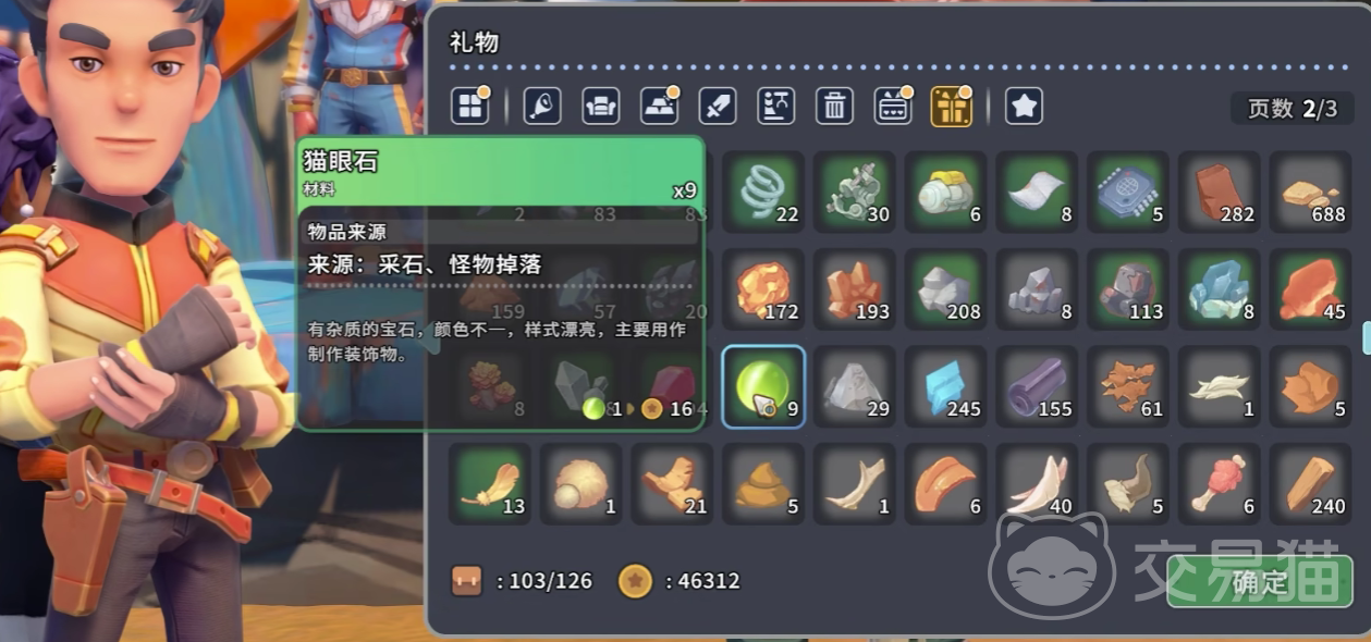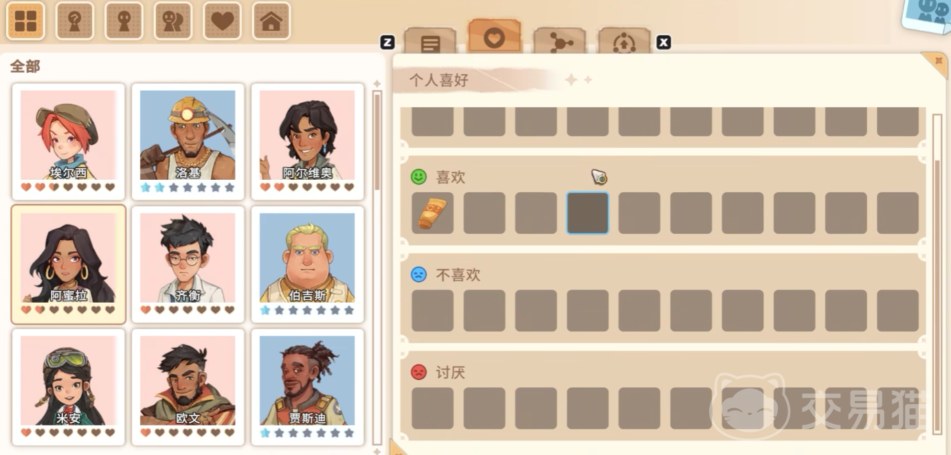 【惟】喜欢的物品有:月光石、猫眼石、古物、精粹钢制以上的镐和斧以及电锯,最喜欢的物品有:玫瑰石,赠送他最喜欢的物品会增加50点好感度,赠送喜欢的物品可以增加10点好感度, 其中猫眼石、月亮石可以通过采石和怪物掉落来获得,而玫瑰石则需要玩家在大世界探索中通过开启宝箱来获得,在【惟】对玩家的好感度抵达了【亲密】的时候,他会赠送玩家工坊相关的道具,例如【工坊主手册】等等。