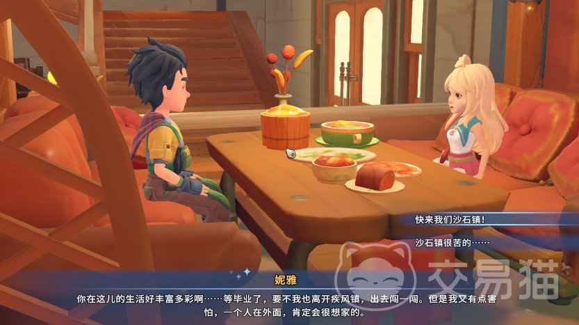 而玩家在这场对话当中有两个选项。玩家可以向妮雅询问自己父母的状况。因为在游戏的剧情当中玩家的父母是在外地工作的,只有玩家重新回到了沙石镇,决定帮助小镇重新繁荣起来。第二个选项则是询问妮雅这些年的学业。选择这个选项妮雅就会大谈特谈,继续讲她在这许久不见的时间中的所见所闻,同时增加一些妮雅的好感。