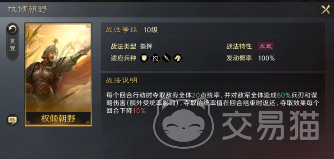 权倾朝野可以迅速的横扫敌方阵营中的统帅,而且还具有叠加Debuff的效果放在阵容中,就能快速的提升整个队伍的实力。横征暴敛: 拥有多种优势,不仅可以自我回血,而且还能够快速的提升减伤,在整个游戏中可谓是可以迅速的大放异彩。 忘私相助:一旦在受伤时马上就可以迅速的恢复队友,主要就能够起到一个团队协作的效果,具有出色的强化作用。