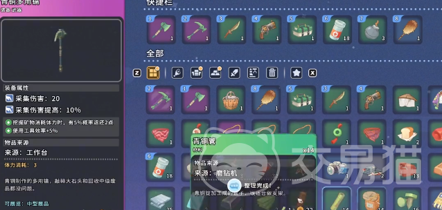 如果是岩石类的资源上面都会看到一个镐的图标,在开采的过程中就需要使用到【多用镐】。如果是植物类的资源就需要使用【多用斧】开采。