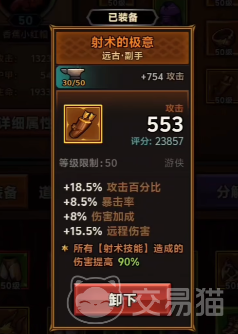 副手也很重要,建议用射术的极意,带上之后可以使所有的射术技能伤害都提高90%,另外还可以增加18.5%的攻击百分比,另外远程伤害也可以增加15.5%。加上还有8%的伤害加成跟8.5%的暴击率加成,可以说这个装备带来的攻击是很可观的。