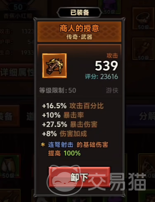 选择一把好武器同样很重要,这里推荐各位使用商人的授意,这是一个传奇武器,可以提升16.5%的攻击,并且还会增加27.5%的暴击伤害以及8%的伤害加成,暴击率也会增加10%。游侠装备上之后,还可以提升100%的连弩射击的伤害呢。
