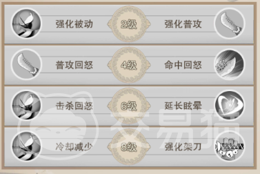 这八个天赋依然是按等级开启了,而按等级来看的话首先要带大家看的是2级时的两个天赋,这两个天赋一个是强化被动,一个是强化普通;之后是4级时的两个天赋,这两个天赋一个是普攻回怒,一个是命中回怒;最后是6级和8级的天赋,六级和八级的天赋为击杀回怒、延长眩晕、冷却减少和强化架刀。从天赋上面来看,不管怎么样组合都是能组出实战效果非常好用的天赋组的,毕竟他的这八个天赋中没有一个是差的,每一个天赋在战斗中的效果都属于顶级。