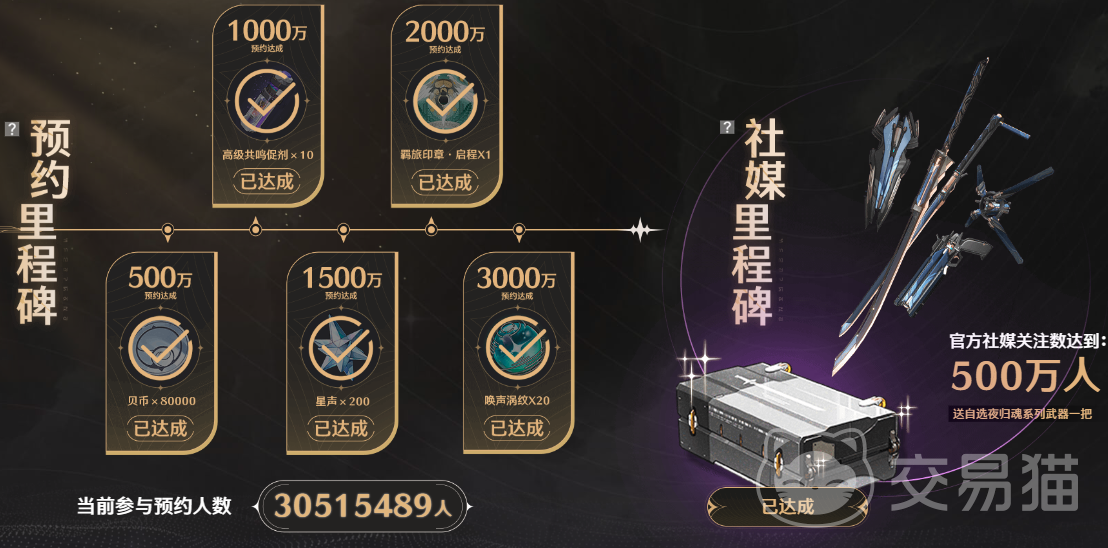 目前全网的预约人数已经超过3000万了,大家可以拿到500万目标的贝壳8万个,1000万达成的高级共鸣促剂十个,1500万目标的200星声,2000万可以拿到羁旅印章启程一个,3000万的时候可以拿到20个唤声涡纹。此外游戏的关注度到达500人的时候,已经解锁了一个自选夜归魂系列武器。