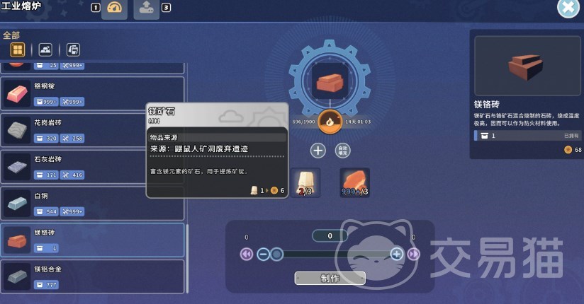 这种镁铬砖的主要用途是拿来建造设施一的,比如说“镁铬炉芯”,就需要3块镁铬砖和3份尖晶石。然后一些装配站的制造也需要用到镁铬砖,比如说高级灶台、工业炉等等,都需要2块镁铬砖。