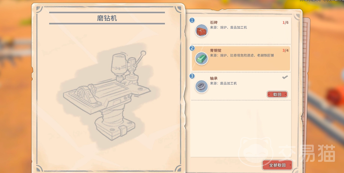 开始任务的时候,需要去清理废墟,可先去制作一台磨钻机,加快打造青铜镐,这样有助于帮大家去高效的清理,要建造磨钻机,要准备六块石砖、四个青铜锭和两个轴承,其中轴承可通过加工机械废料获得,而石砖和青铜锭的获取相对简单,青铜锭可在熔炉中由锡矿石制成,而石砖则可通过在地图上搜集。