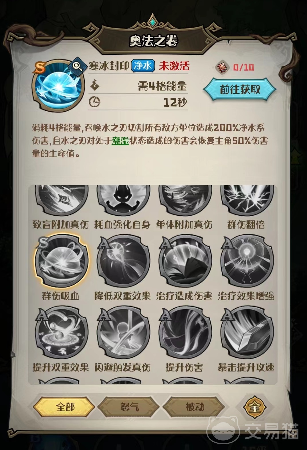 在细节方面,主角定位就是给对手挂上潮湿状态以及抗伤害和吸血,需要搭配上以下几个技能。S级寒冰封印,a级救赎和ss级施法秘诀以及b级水流冲击这几个。施法秘诀需要消耗四格能量,让己方单位冷却状态下的技能加快冷却时间读秒,并使得其他单位在下一次释放技能时造成的伤害提高。寒冰封印可以召唤水之刃对敌方单位造成水系伤害,对处于潮湿状态的伤害会额外恢复生命值,对方带有潮湿状态越高,伤害也就越多。水流冲击是整套阵容的发动机,召唤水流冲击敌方单位,有很高的几率为其附加潮湿状态持续5秒钟,对方被潮湿影响后会降低闪避率。
