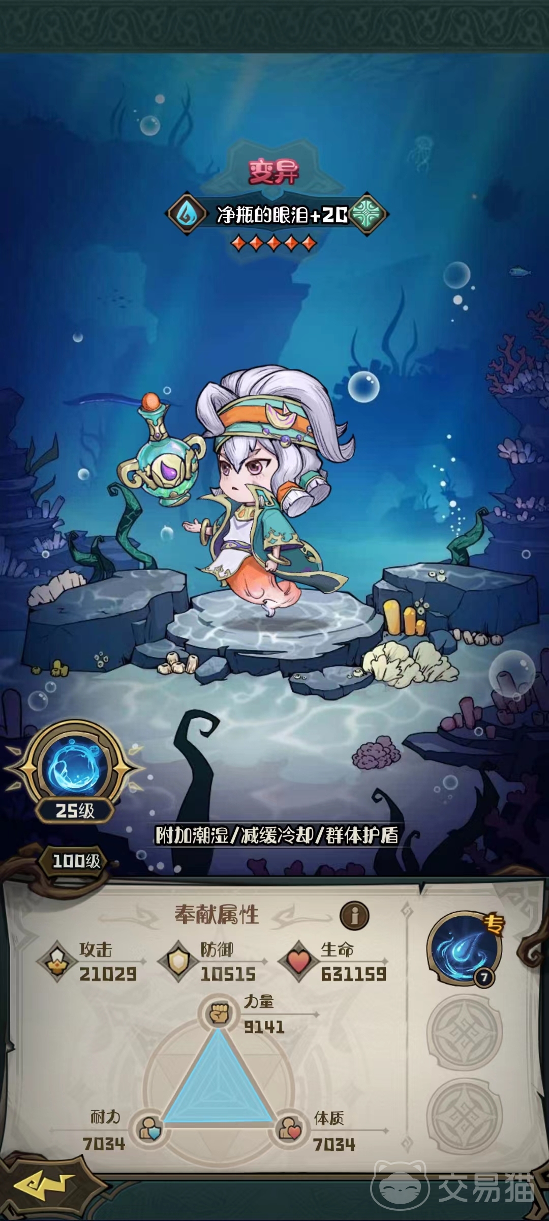 净瓶眼泪也是挂潮湿状态的角色,还拥有护盾保护能力,搭配上技能术能鼓舞和固阵坚守。术能鼓舞在每次释放技能后,提升己方所有单位的伤害和伤害减免,并且是一种可叠加效果,最多叠加5层,一直持续到战斗结束。固阵坚守是在进入战斗后,己方所有单位都能获得高额伤害减免,此后会逐渐衰退,一直到30秒后效果降低至0。但此状态不可被驱散,所以也是很好的防御性技能,尤其适合面对敌方爆发性输出,更是能够通过前期阶段。