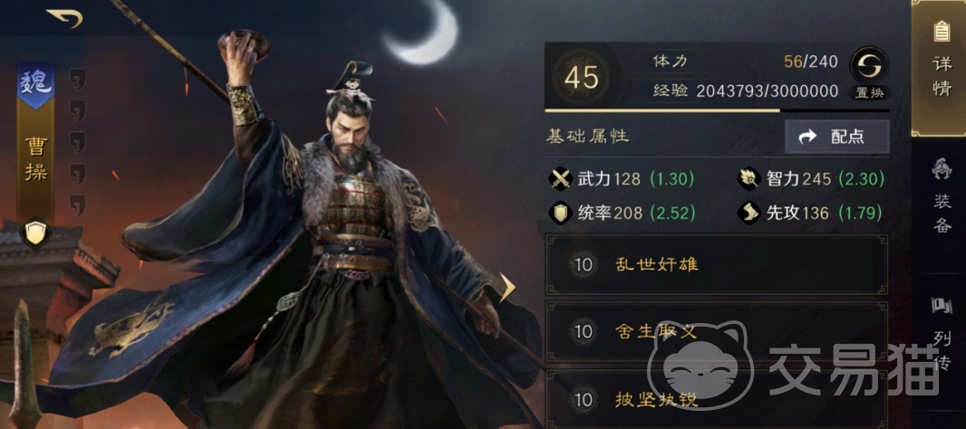 在该阵容之中,曹操主要就是作为曹操担任主坦克角色,全程为队伍提供伤害减免效果,此外利用战法乱世奸雄的能力,能促使前排的吕布吸收血量,保持在战场上的稳定性。