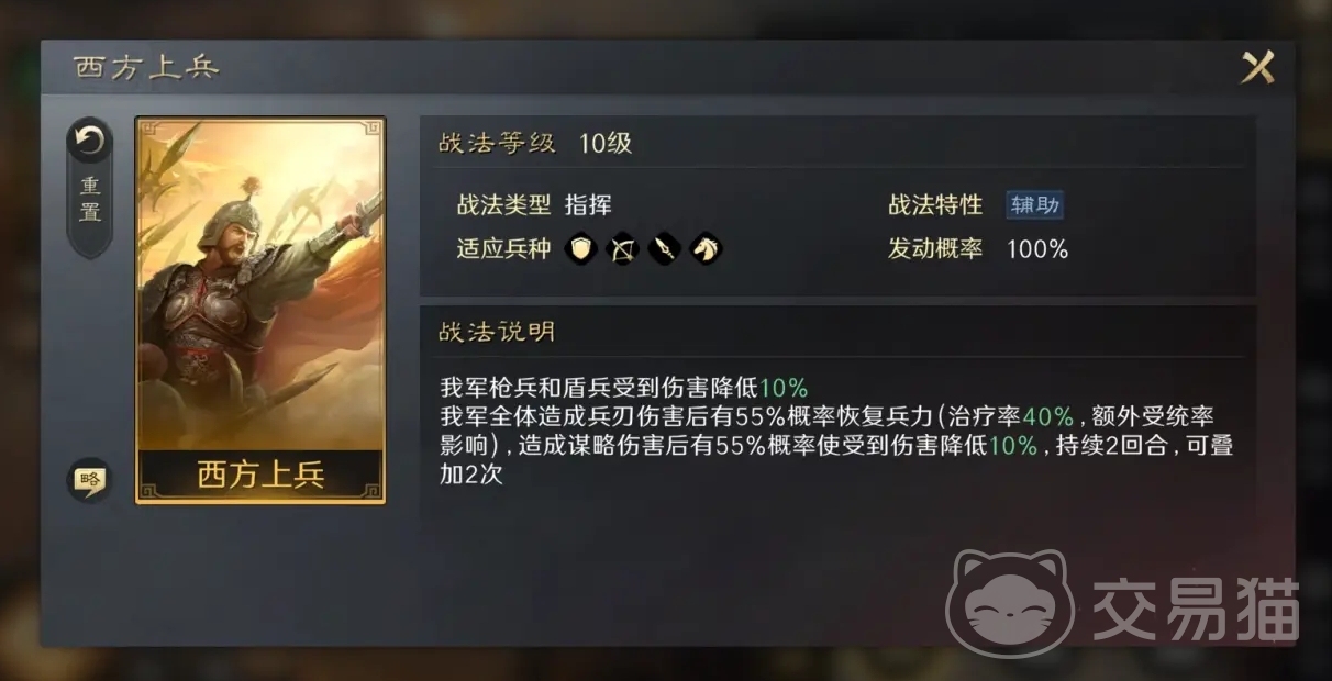 该武将的自带战法是西方上兵,这是一种指挥战法,为己方的枪兵、盾兵提供减伤的效果,此外,每当武将造成兵刃或谋略伤害时,该战法都能为其提供自我恢复或是额外的减伤效果。