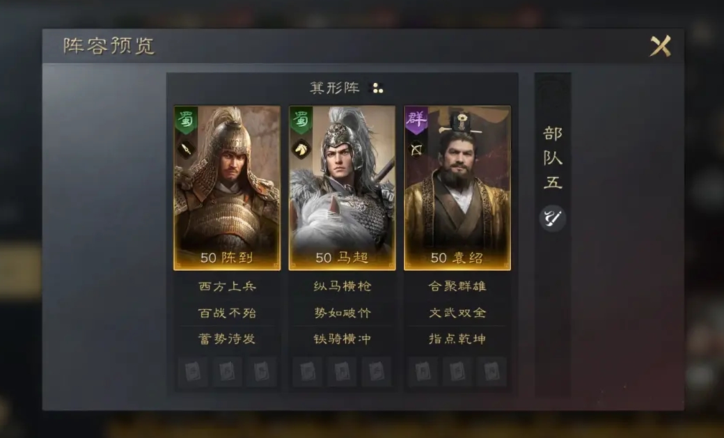在阵容搭配方面,小编建议大家可去选择马超和袁绍,在该阵容之中,陈到的战法可与马超和袁绍很好的配合,陈到的减伤和自我恢复能力可确保马超的生存,而袁绍则可辅助马超对敌方全体进行攻击,频繁触发马超的纵马横枪,从而造成大量的输出伤害,这种组合能在战场上形成强大的攻势效果。