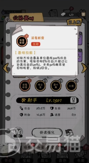 公孙离的大招能够对敌人最高造成高达500%的攻击伤害,并吸取对方8%的攻击力为自己所用。还有一定的概率将其眩晕,所以想要快速消灭对方主力的话。就要用这个技能,将其击杀,就能源源不断地增加自身的实力。