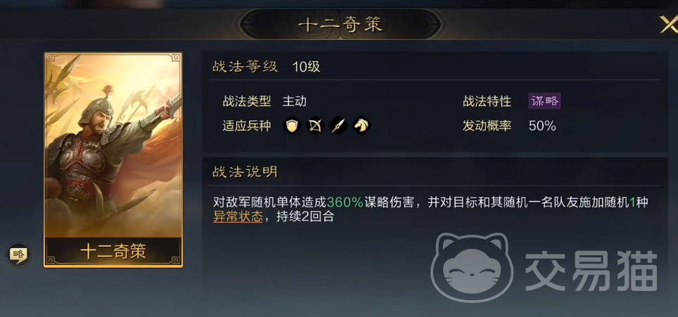 荀攸自带战法十二奇策:主动谋略战法,对敌军随机单体造成360%的谋略伤害,并且对于目标和随机一名队友施加一种持续两回合的异常效果。目前游戏里一共有12种异常状态,挂上的异常状态也是随机生成的,如果还有荀攸专属奇策金书,发动异常优先施加控制的状态。带有控制效果的debuff分别是:断粮、技穷、缴械、嘲讽、混乱、震慑、虚弱七种。因此荀攸的控制效果比徐晃要强,一连串的控制很足。