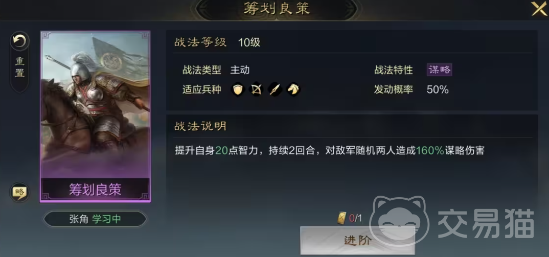 郭嘉优先携带奇门遁甲与出其不意。奇门遁甲的控制效果与伤害,也只有队伍里面的郭嘉才能发挥出最大的效益,因为没有一种异常状态,所体打出的谋略伤害提升1/4,震慑的概率也提升8%。出其不意也是个不错的谋略战法,对挂有负面状态效果的敌方增加额外伤害。最后一个战法,可以选择紫色的谋划良策,提升20点智力值,并且随机打两下谋略伤害。