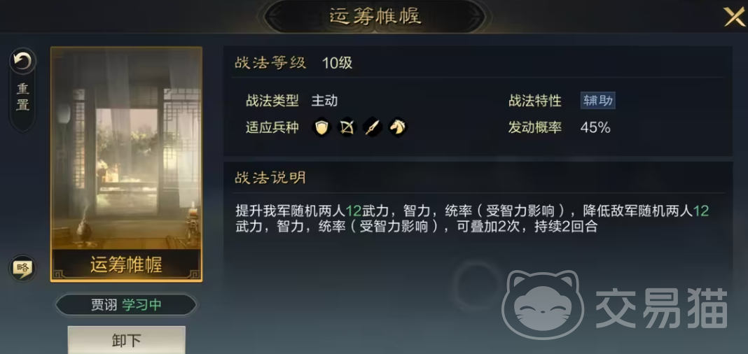 贾诩优先携带运筹帷幄、巧利天灾,天灾战法是给全体敌方大量效率挂debuff的核心,面对火攻、洪水、风暴状态的敌军,分别施加混乱、缴械与技穷效果。