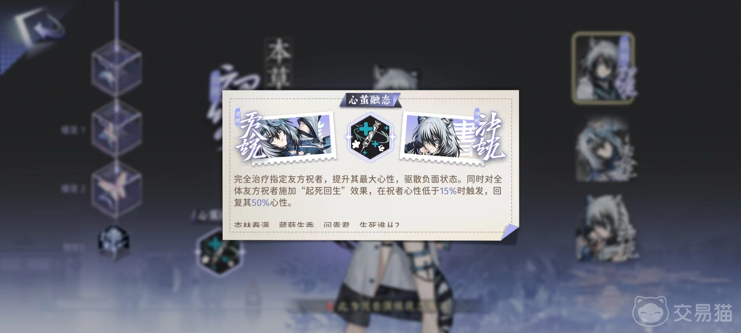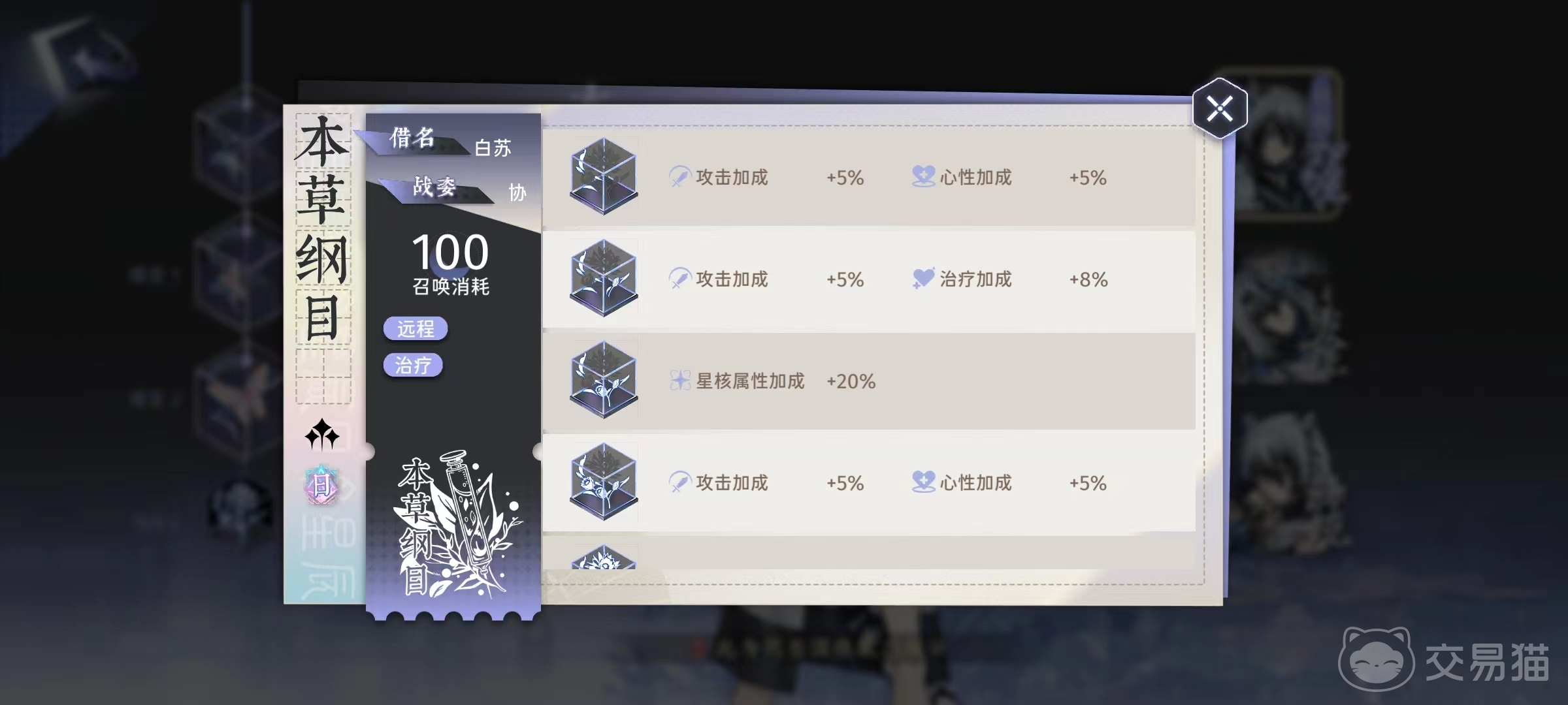 在游戏中本草纲目的借名为白苏,它的战斗姿态为协,需要大家消耗100点能量召唤出来,作为一名远程治疗角色,也符合本草纲目这个名字的特点。它最主要的新心茧融态为对指定的友方祝者进行完全治疗,并且提升最大心性属性,将其身上负面状态驱散,还能对全体友方祝者施加起死回生效果。该效果在被施加后,心性低于15%时会自动触发,恢复50%心性。