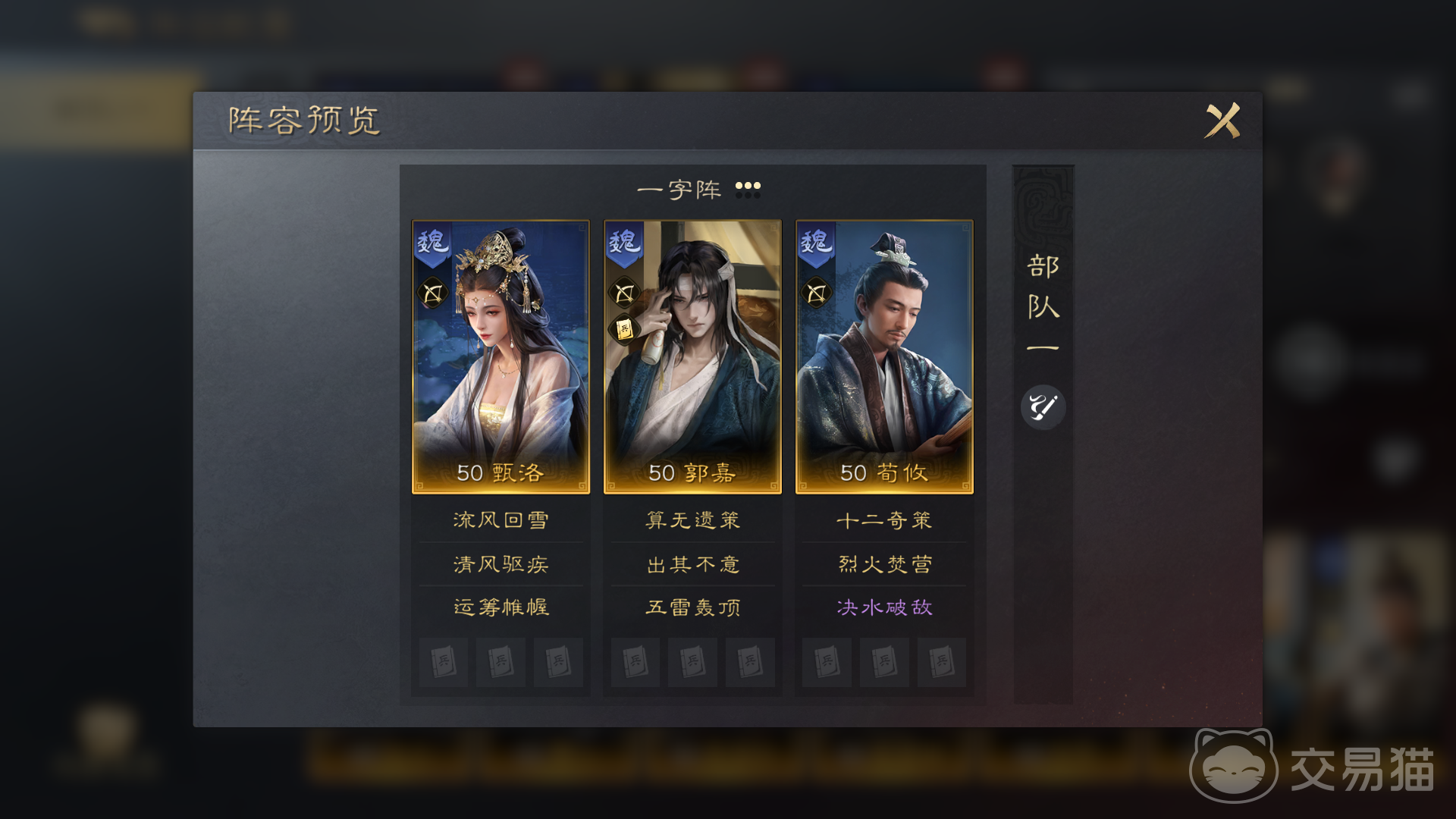 除了张角之外,另外一名高智力角色郭嘉也适合选择,郭嘉优势在于可利用自身技能提高主动战法发动率,还有几率跳过准备阶段立即释放五雷轰顶,所以整体伤害也很值得期待。郭嘉在选择了五雷轰顶后,另外一个技能可搭配上出其不意,阵容方面荀彧、荀攸这二人是很好的搭档,由荀攸来学习决水破敌和烈火焚营,这样就有了足够的异常状态。
