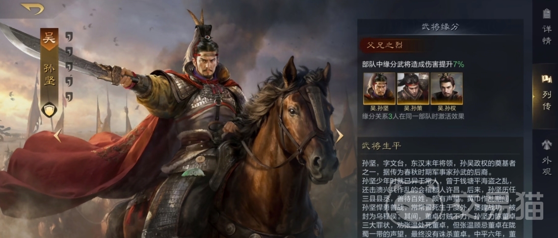 孙坚是吴国的名将,稀有度为最高的橙色,在游戏里面与孙策、孙权有缘分武将效果:父兄之烈,缘分武将造成伤害提升7%,三个人同在一个部队时才激活。