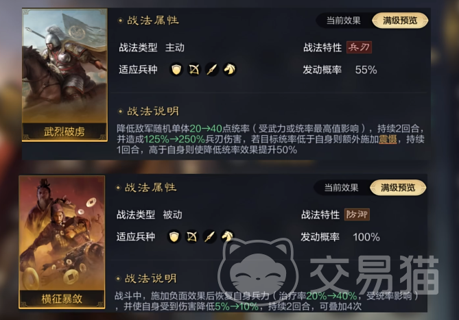 孙坚作为首选前排,大部分防御战法都可以携带,除了自身所自带的武烈破虏,比较推荐上横征暴敛,这个防御被动类型战法,可以恢复自身最高40%,而且治疗量受统率值影响,就很适合孙坚这个高统率武将。