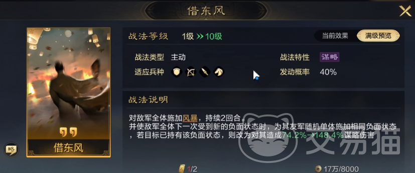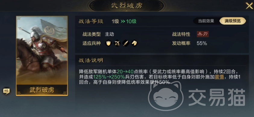 主动技能:武烈破虏。主动战法兵刃特性,降低敌军随机单体20~40的统率值,效果持续两个回合,并且造成125%~250%的冰刃伤害,如果目标的统率则低于自身者。额外施加震慑,持续一个回合,如果高于自身则降低其统率的效果提升一半。孙坚的技能有三段的效果非常灵活,不过因为本身武力的伤害不高,第2段打伤害的作用只是锦上添花,主要还是依赖孙坚降低目标统率,并打出震慑这一控制。