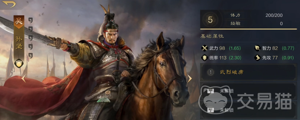 孙坚基本数值面板:武力1.65,智力0.77,统率2.3,先攻0.91。从四维属性可以看出,孙坚在游戏里面的定位不是主力的输出,而是偏向于一个统率型的前排。