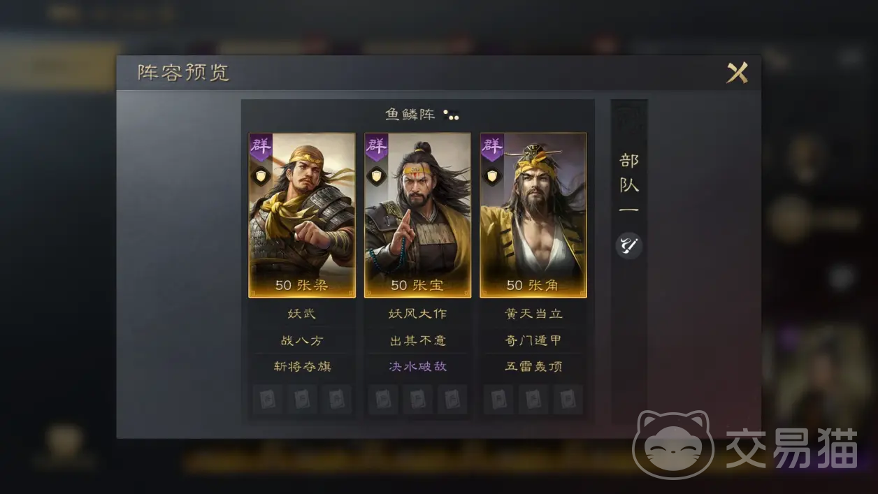 结合当前测试过程中的武将属性,小编认为出其不意和张宝的妖风大作是很合适的组合。张宝的妖风大作效果,可以为随机两名目标造成谋略伤害,并且有妖术和风暴这两个不同异常状态添加,添加之后能持续两个回合。这样即使敌方携带一些驱散战法,也可以进行有效针对,触发出其不意的额外增伤。在张宝学习了出其不意之后,搭配上其他一个能够造成异常状态的技能,例如紫色的决水破敌就可以成型了。加上张梁和张角这三兄弟组成一套阵容。既可以保证首回合全队所有战法发动概率,起到先发制人效果,更拥有了大量异常状态来保证触发额外伤害。