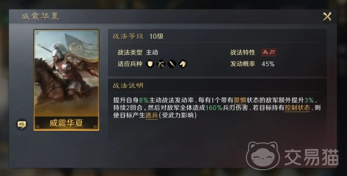 威震华夏是他的主动战法,能提高自身战法发动概率,并对敌方全体造成伤害,此外如果敌方有控制,该战法还可触发逃兵效果。