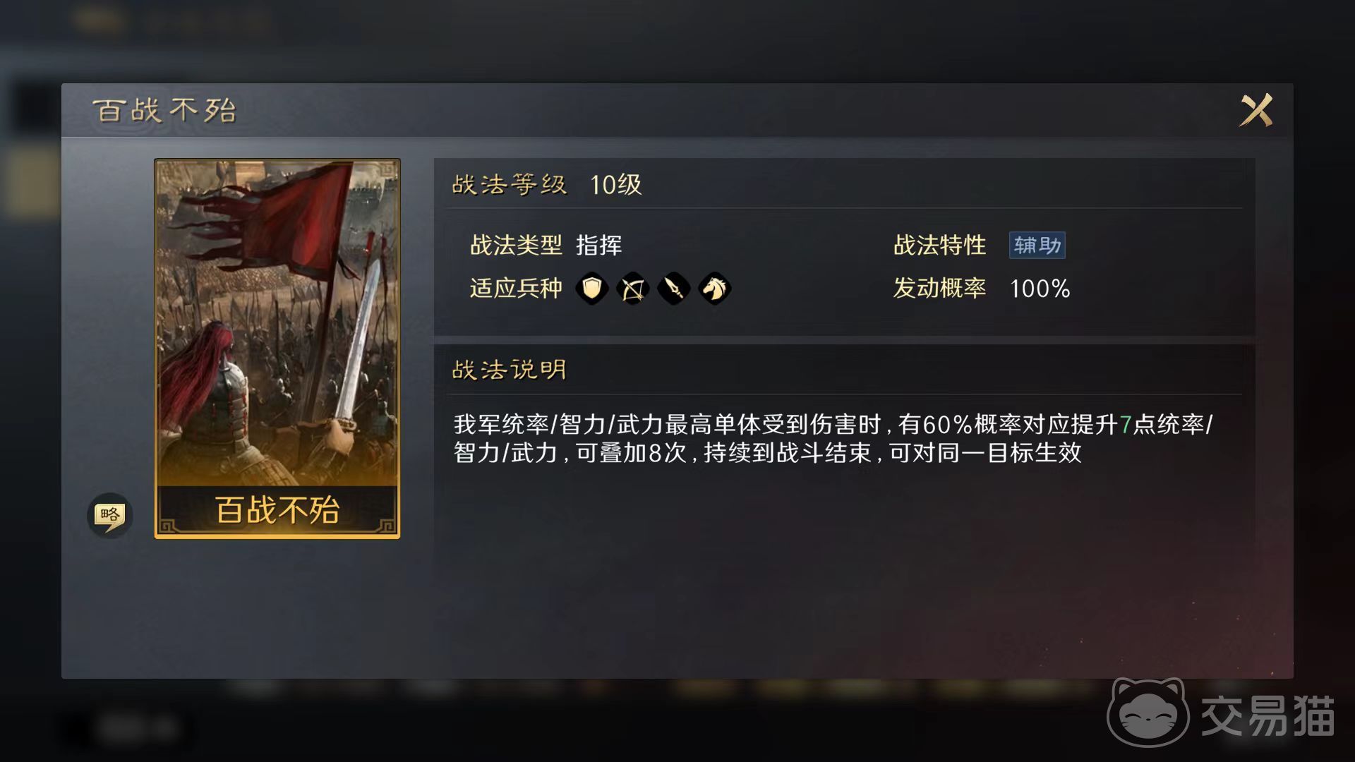 百战不殆属于指挥类型,适用范围广,目前所有兵种的武将都能使用,有着很好的辅助特性。指挥类战法特点是100%发动,没有几率上的问题,在发动之后,我方统帅、武力或智力这三项属性最高的单体,受到伤害时有几率提升对应属性,可以叠加8次,持续到战斗结束,能够对同一个目标生效。也就是受伤次数越多,属性加成也就越高,该战法可以通过寻访获得。