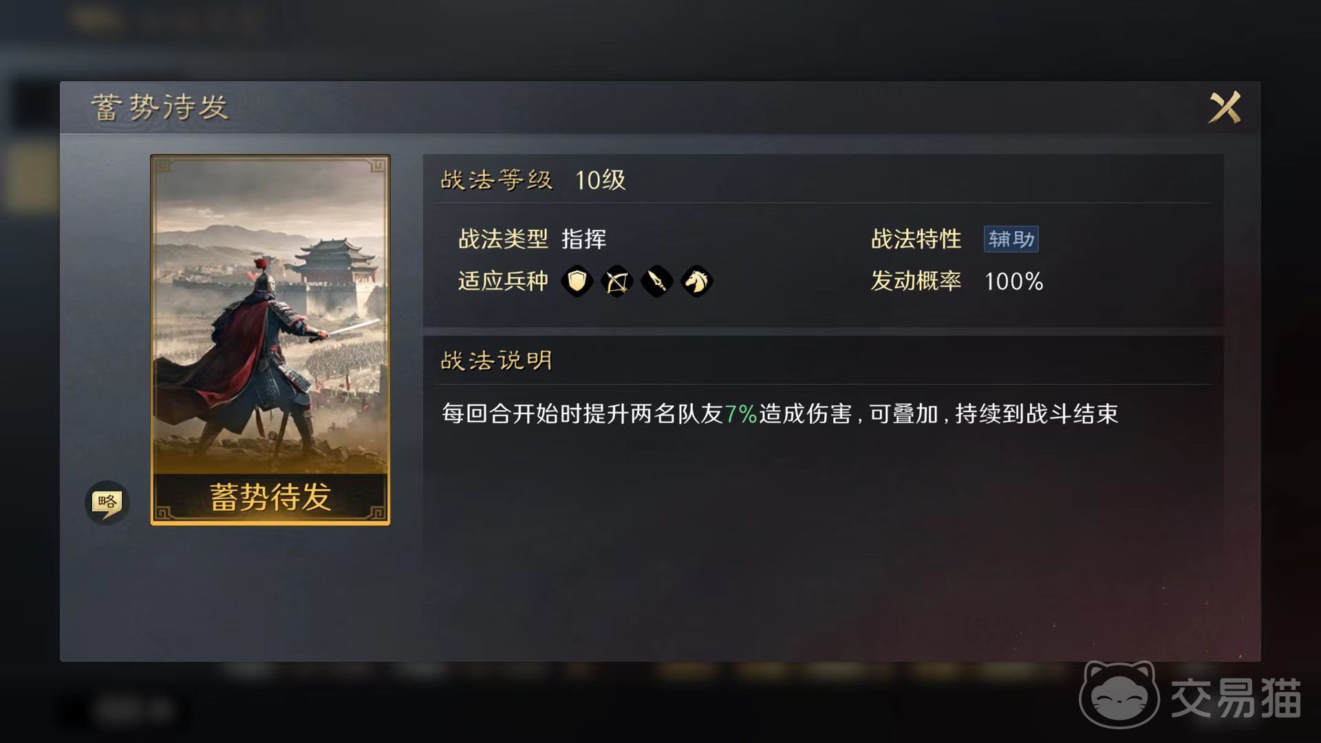 第3个推荐的是百战不殆和蓄势待发结合起来,蓄势待发也是指挥型辅助技能,双方在效果方面极其相似。蓄势待发可以在每回合开始提升队友伤害,同样能叠加一直持续到战斗结束。两个战法结合起来,为部队提供高额属性输出加成。可以选择给邓艾学习上,然后邓艾搭配张郃、徐晃,这样一套适应程度极强的阵容也就诞生了。