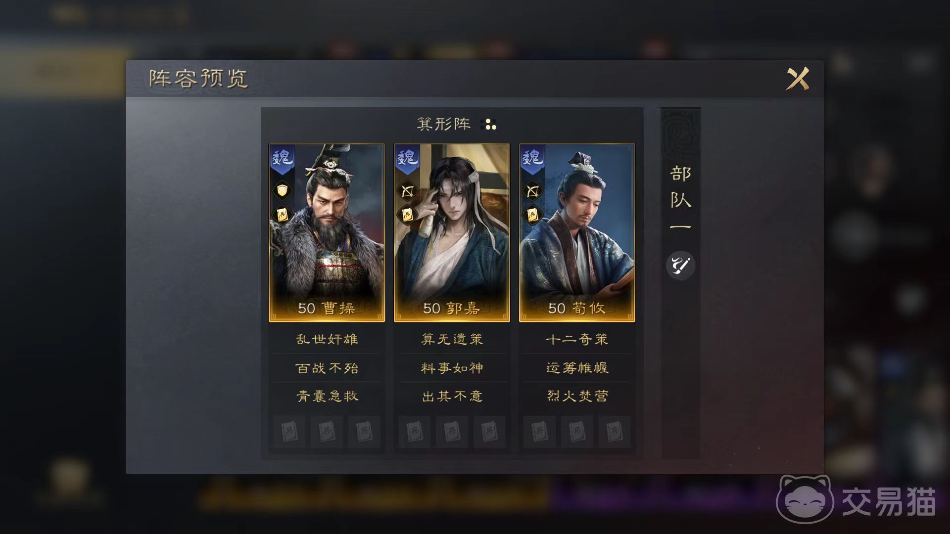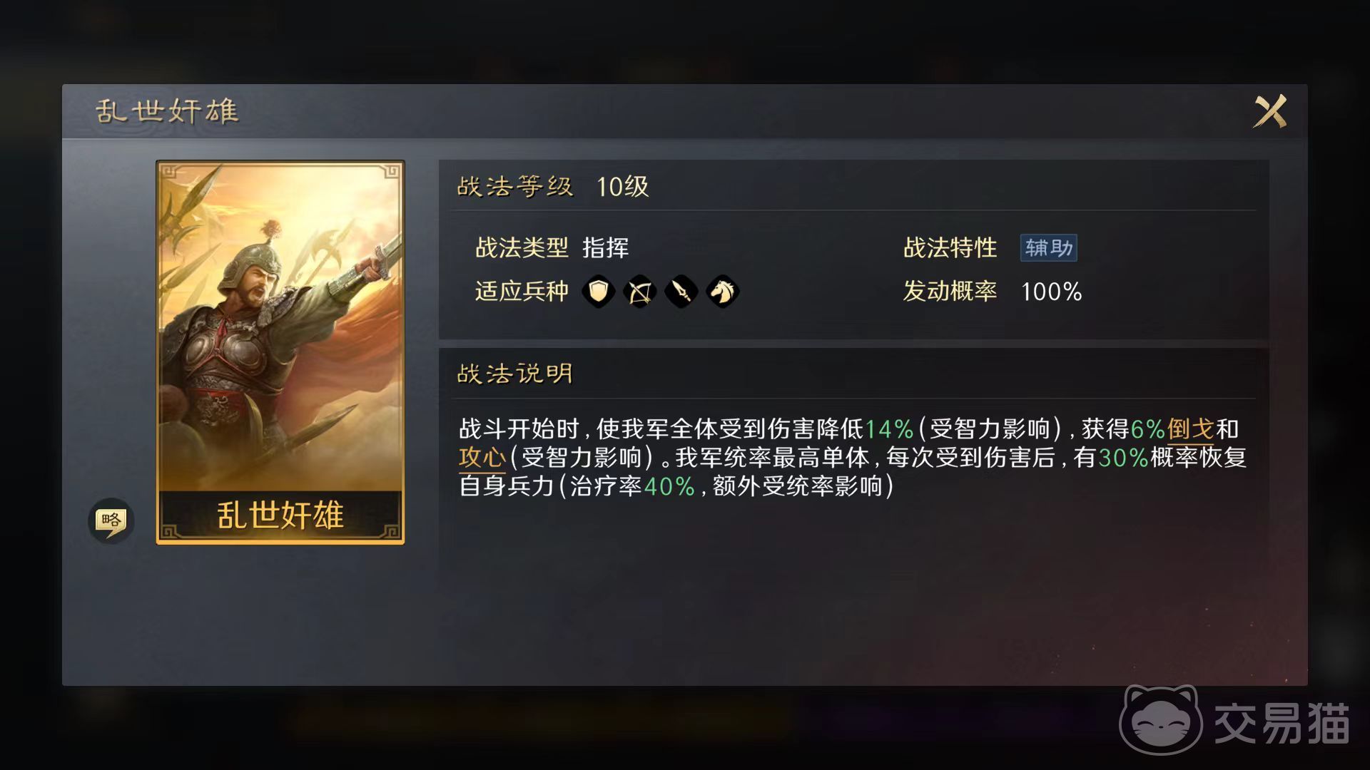 也可以选择和曹操搭配起来,曹操自带战法是乱世奸雄,效果为使我方全体受到的伤害降低,并获得倒戈和攻心,另外统率最高的单体在每次受到伤害后有几率恢复自身兵力。因为曹操的治疗效果受统率影响,而百战不殆刚好可以为统率最高的武将提高数值,所以相互配合非常出色。在阵容方面有了曹操之后,再加上荀攸和郭嘉,这样智力也能获得提升,让输出更为暴力。