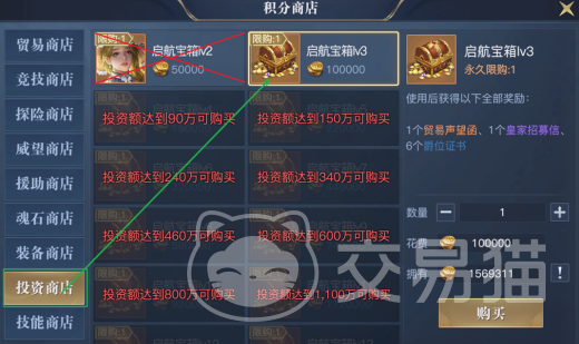 第二种贸易声望需要大家进入投资商店中,购买宝箱,每个等级的宝箱只能购买一次,同时大家要注意等级2的宝箱是没有贸易声望函的,大家要从等级3的开始买起,购买并使用后也能得到100点经验。