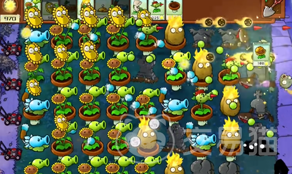 有一定阳光后就可以将输出型植物全部种上,同时在墓碑的前面种植好火炬坚果,放置其最后一波直接攻击我们的植物,这样按部就班过关后,就能解锁植物最强向日葵。