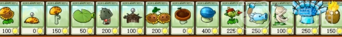 那么来看植物,在植物的选择上需要去带杂交阳光菇、樱桃向日葵、红眼迷惑菇、大蒜食人花、加强寒冰菇、花盆小喷菇、杂交豌豆、杂交荷叶、猫尾冰豌豆和火焰坚果、冰瓜大喷菇这几个植物。