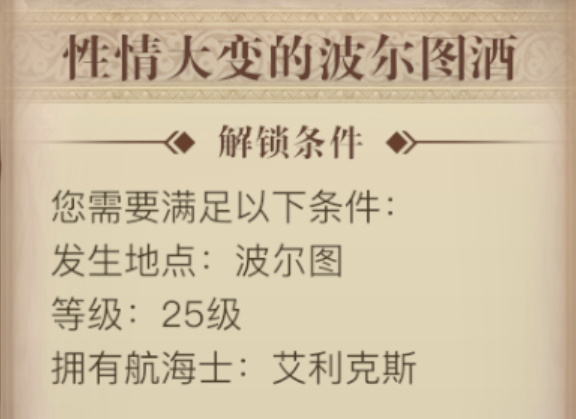 以上内容就是本期小编给大家带来的黎明之海性情大变的波尔图酒如何触发的全部内容了,在触发了这个船长见闻之后,玩家会的获得藏宝图的相关奖励,并且获得船长见闻的收集度,当船长见闻的收集度达到了100%后,玩家就能获得外观奖励,希望看完本期攻略的小伙伴们都能够有所收获哦!