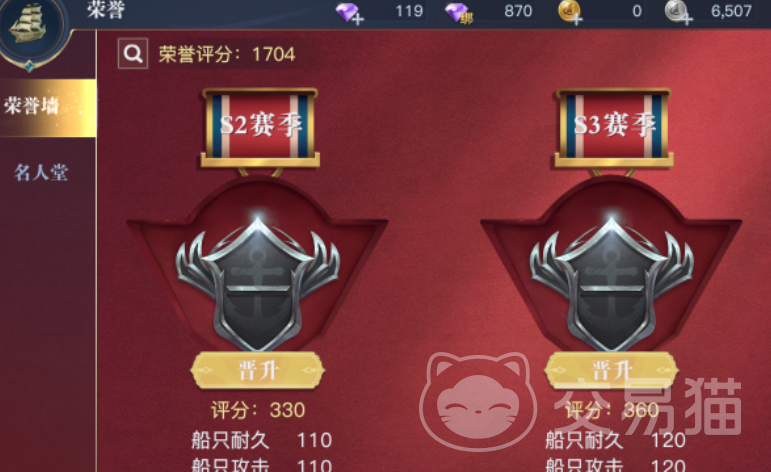 首先,玩家需要点击【个人】找到【角色】这个面板,随后点击【威望】这个界面,在【威望】界面的左下角一个荣誉勋章的小图标就是对应玩法的入口了,荣誉墙中的每一个勋章都是有一定的加成的,比如船只耐久度和船只攻击力等等,勋章的等级越高玩家能够获得的加成就越高,并且这个是赛季性质的,玩家在第二个赛季就会从零开始。