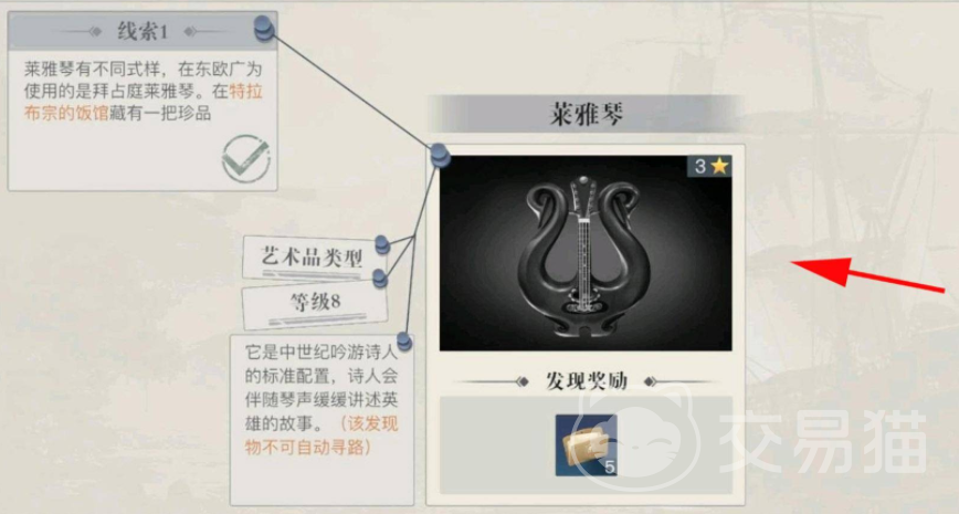 首先系统会给予小伙伴们2点关于莱雅琴的提示。第一是莱雅琴有着不同的样式,而东欧的人们通常使用的都是拜占庭莱雅琴。第二是莱雅琴是吟游诗人的标配物品,吟游诗人们会一边弹琴一边向人们讲述英雄的故事。根据手上有的线索,小伙伴们不难发现莱雅琴的位置就在特拉布宗的饭店中,并且它是一把等级为8级,较为稀有的艺术品,但是像这种发现物都是不能自动寻路的,因此小伙伴们无法通过系统的帮助寻找到它,必须要自己亲自前往才行。